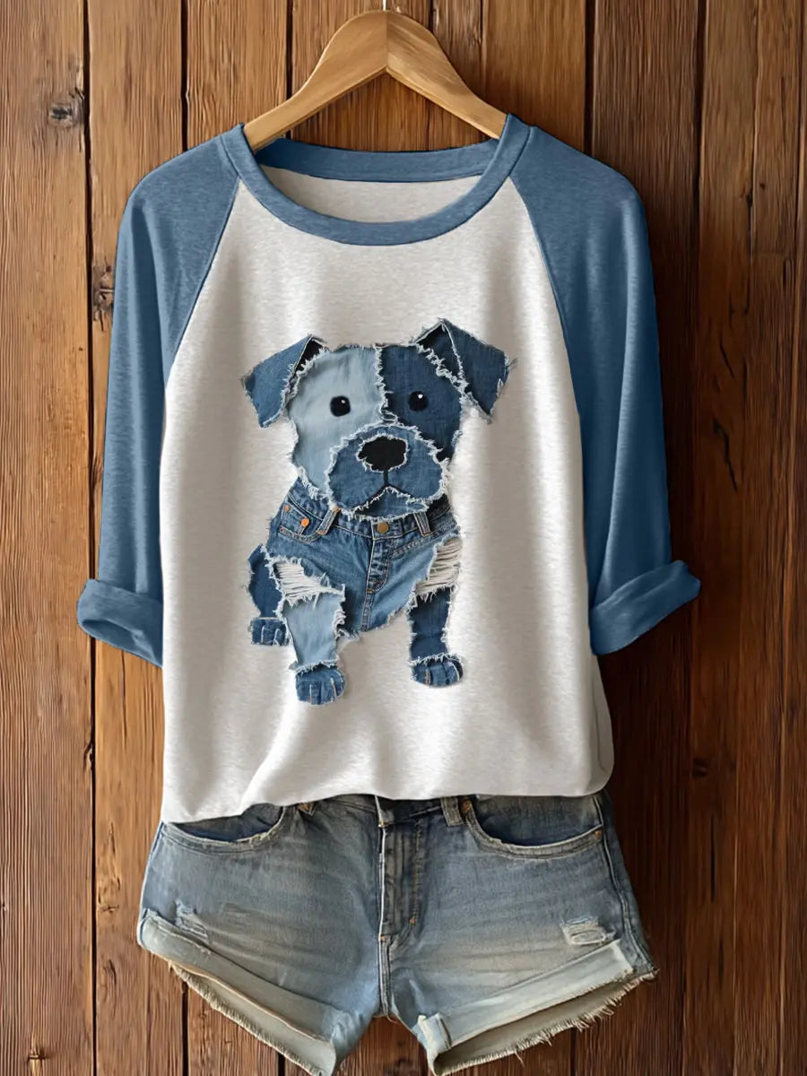 Frauen niedliches Hunde-Patchwork-Kunst-T-Shirt mit langen Ärmeln