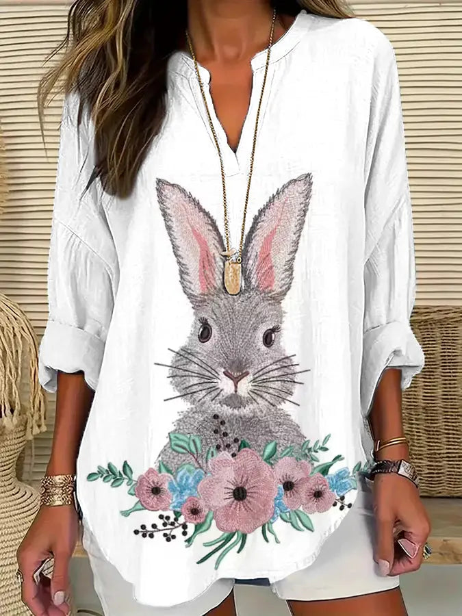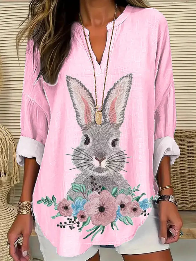 Damen Eatser Niedliches Häschen muster Bedrucktes Langarm-Hemd mit V-Ausschnitt