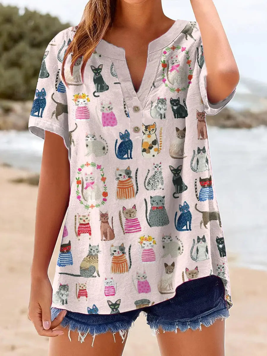 Damen-Katzen-Kunstdruck-Leinen hemd