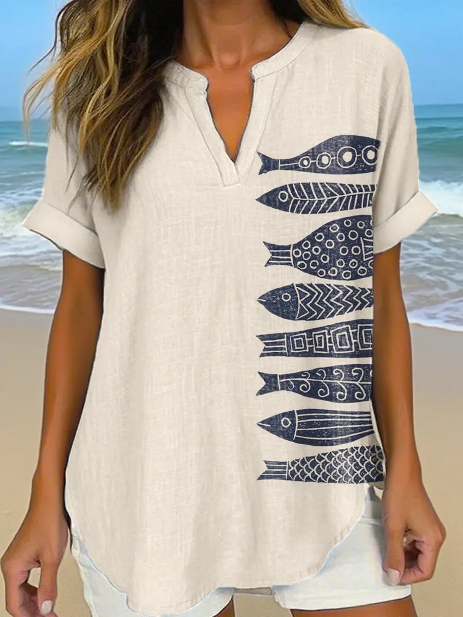 Damen Vintage Fisch Kunstdruck Leinen hemd