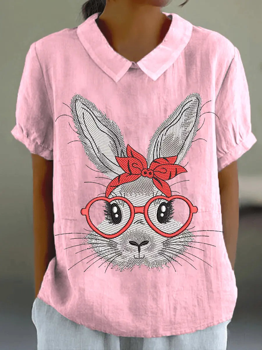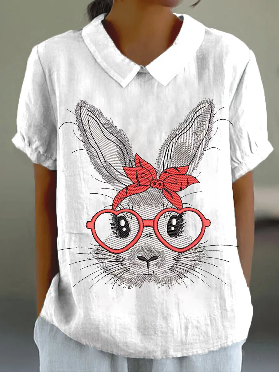 Damen Eatser Niedliches Häschen muster Bedrucktes Kurzarm-Baumwoll-Leinen hemd