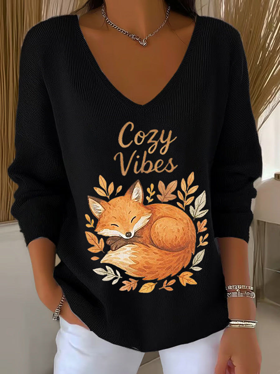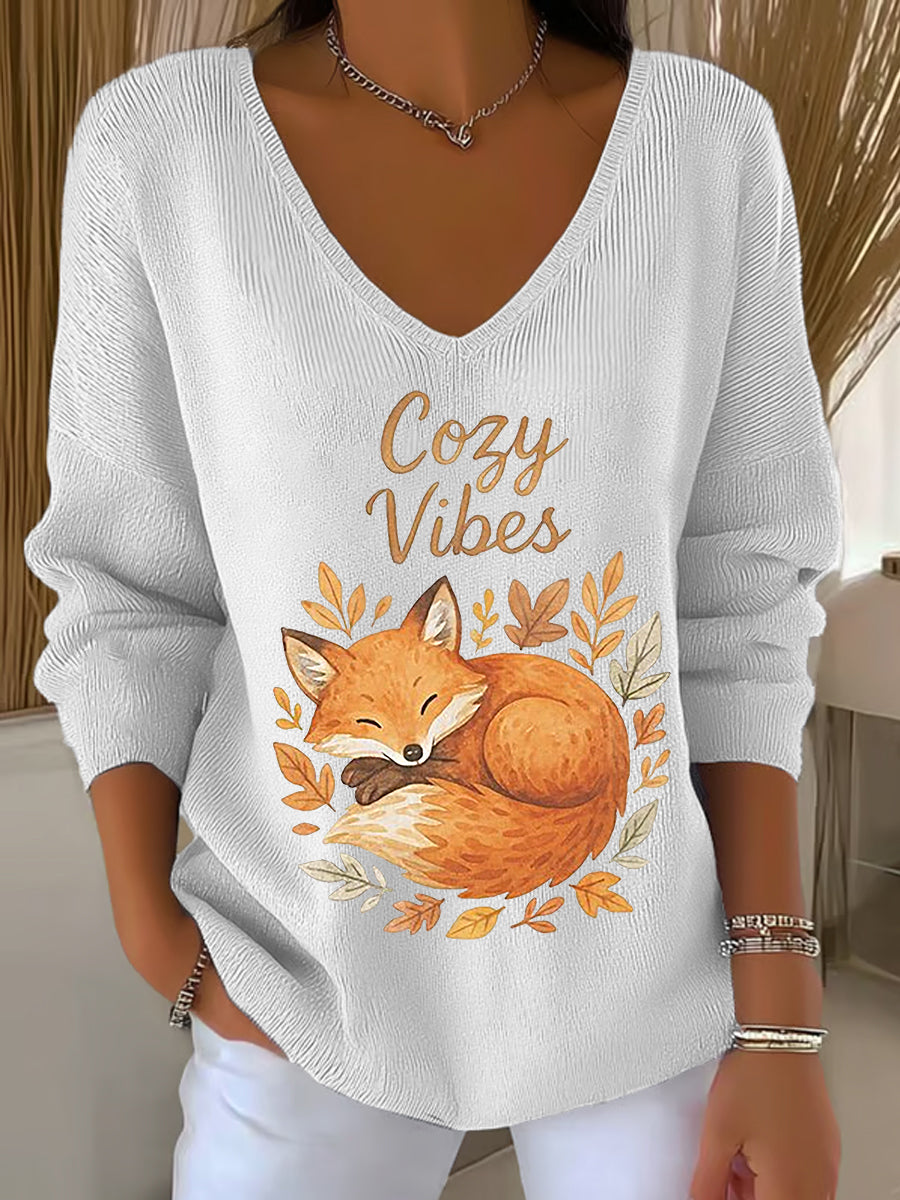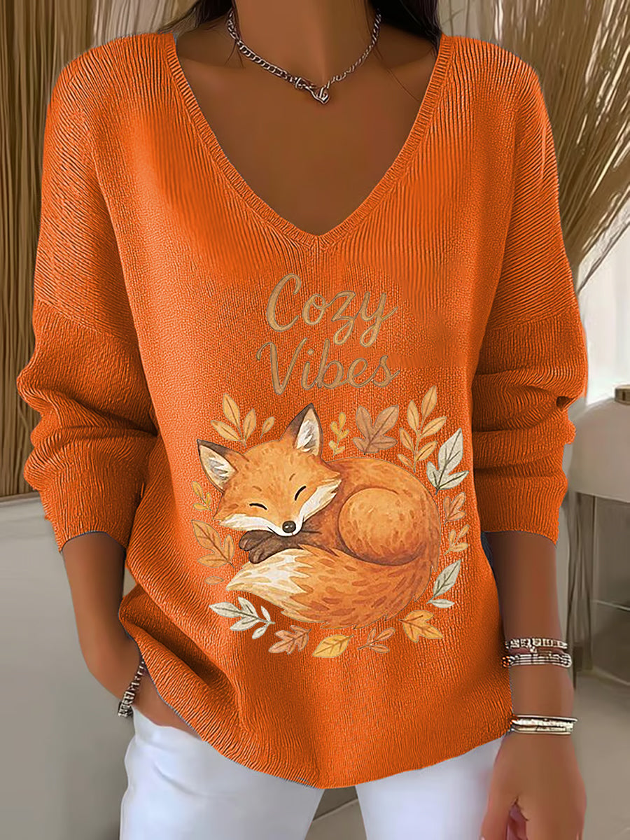 Damen-Herbst blatt Fox bedrucktes V-Ausschnitt-Oberteil