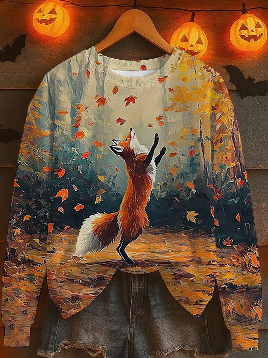 Damen-Herbst-Blatt-Fuchs-bedrucktes Langarm-Sweatshirt
