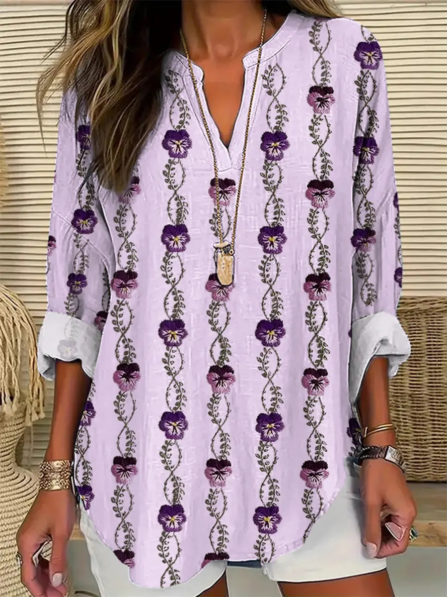 Frauen Alzheimer-Bewusstsein Lila Blume Bedrucktes Baumwoll Leinen Langarm Hemd