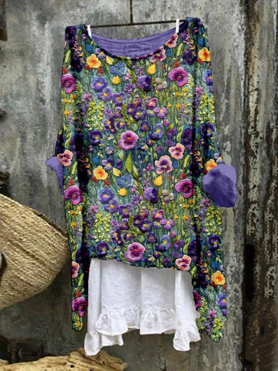 Frauen Alzheimer-Bewusstsein Lila Blumen bedruckt O-Ausschnitt Baumwolle Leinen bequemes langärmliges Hemd
