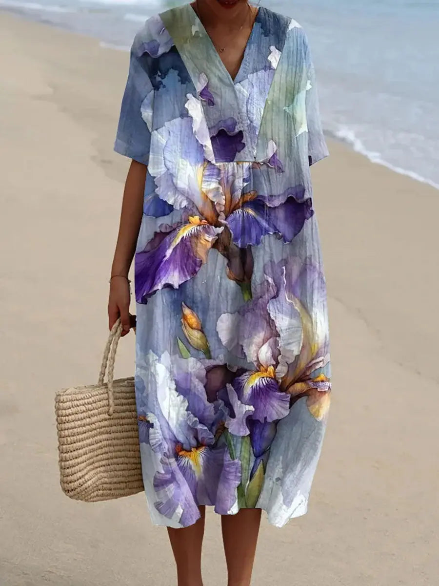 Frauen Alzheimer-Bewusstsein Lila Blumen bedruckt V-Ausschnitt Baumwolle Leinen bequemes lang ärmel iges Maxi kleid
