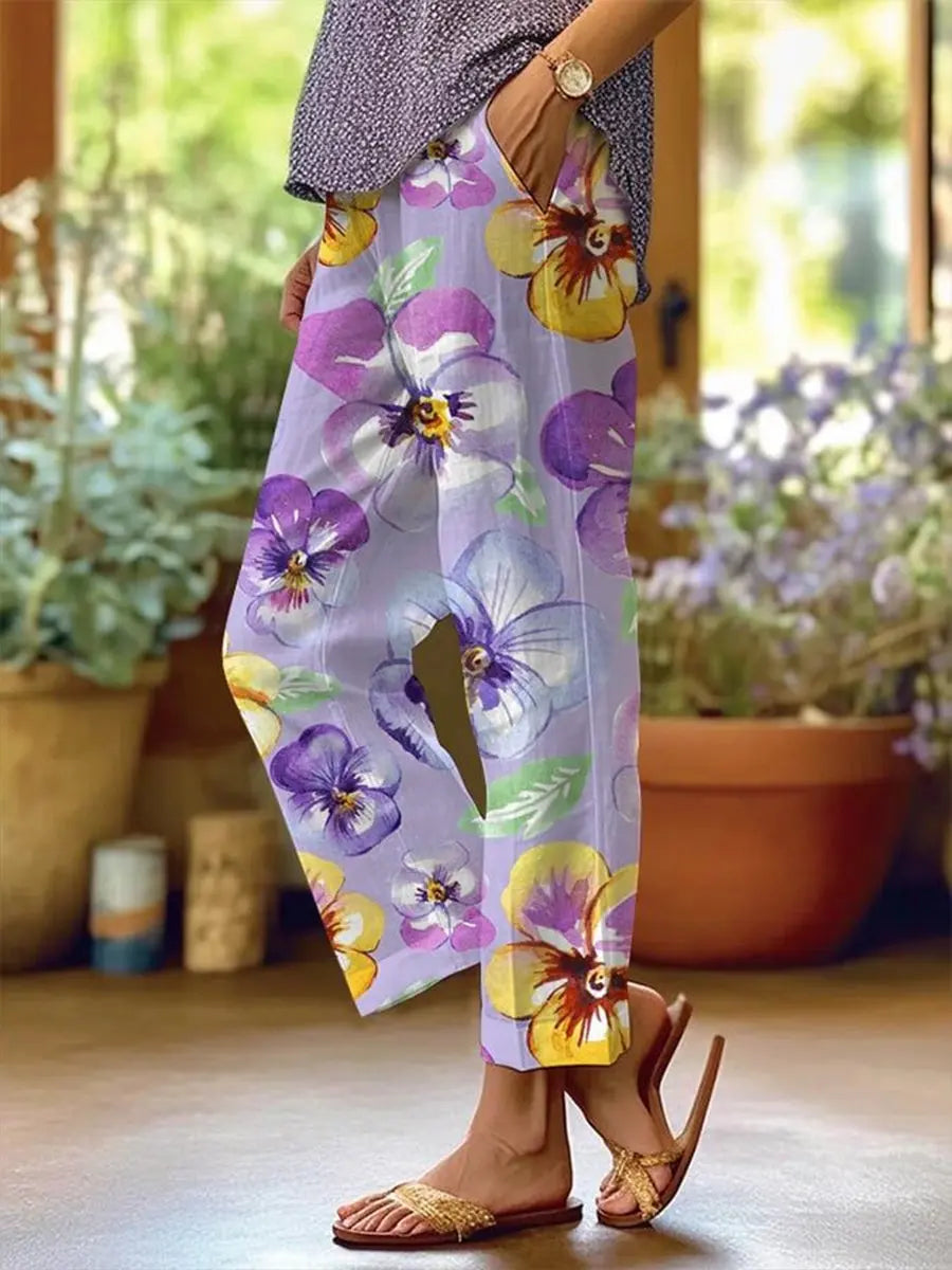 Frauen Alzheimer-Bewusstsein Lila Blumen bedruckte Leinen hosen aus Baumwolle