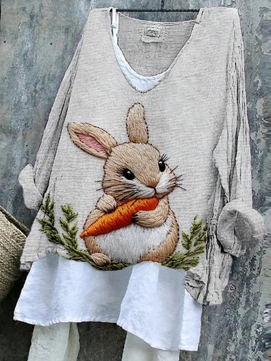 Frauen niedliches Kaninchen muster bedrucktes Baumwoll-Leinen mit V-Ausschnitt, bequemes langärmliges Hemd