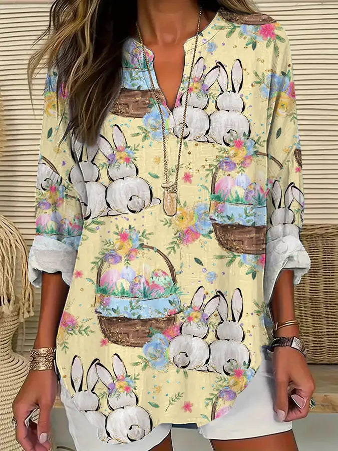 Langärmliges Häschen eier mit V-Ausschnitt, Baumwoll-Leinen, T-Shirt