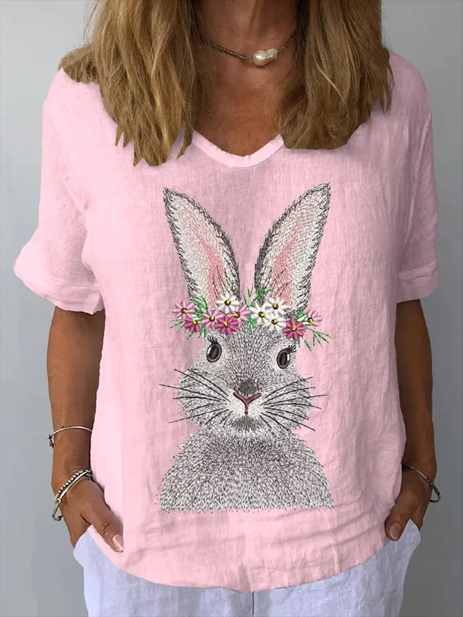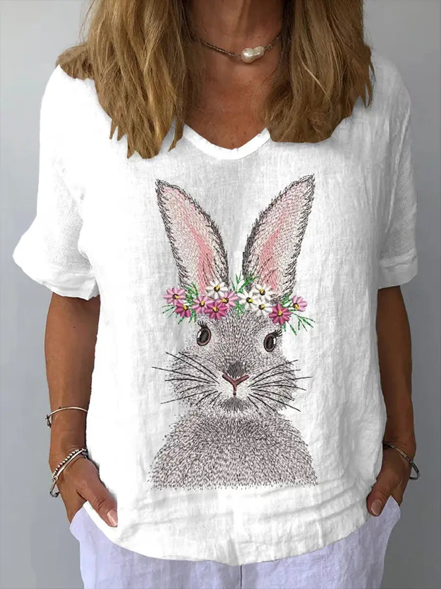 Damen-Osterhasen-Print mit lässiger V-Ausschnitt aus Baumwolle und Leinen