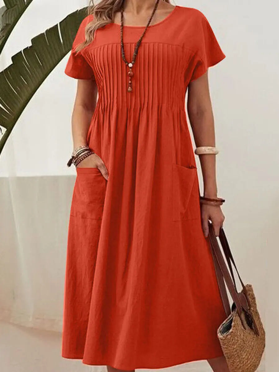 Frauen einfarbig mit rundem Hals, gefaltetes, kurzärmliges Baumwoll-Leinen kleid